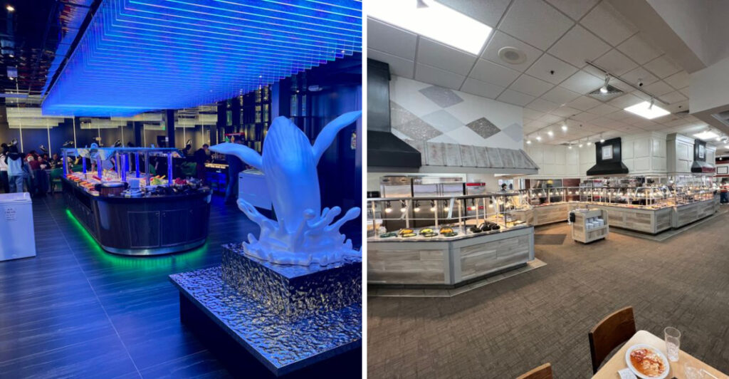 Crab legs piled high, sushi rolls gliding past on display, and the sizzle of custom stir-fry hitting a blazing grill. The energy is loud, bright, and unapologetically indulgent.