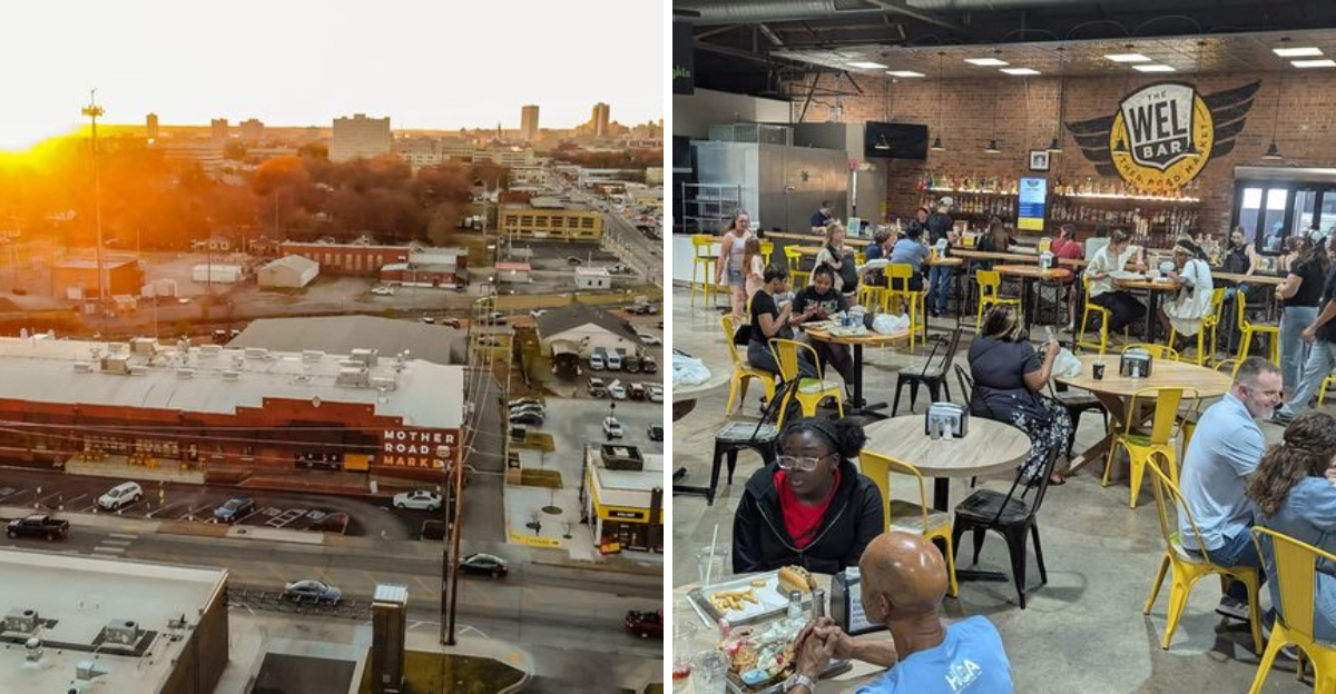 Some buildings just carry a mood, and this one absolutely does. Mother Road Market is housed in a repurposed warehouse along the iconic Route 66 corridor in Tulsa, and the architecture alone earns a second look.