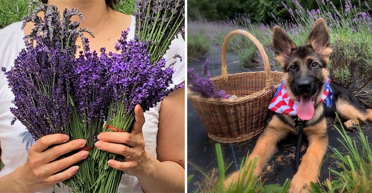 Walking a leashed dog through lavender rows while you pick your own bundle is a genuinely idyllic afternoon.