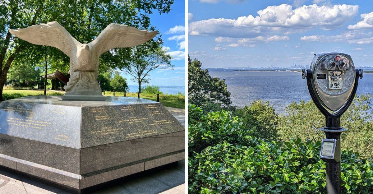 At the heart of Mount Mitchill stands one of New Jersey’s most moving tributes to September 11th, a memorial that honors the 147 Monmouth County residents who lost their lives on that tragic day in 2001. The centerpiece features a striking bronze eagle sculpture clutching an actual piece of steel beam salvaged from the fallen Twin Towers, a powerful symbol that connects visitors directly to that fateful morning.