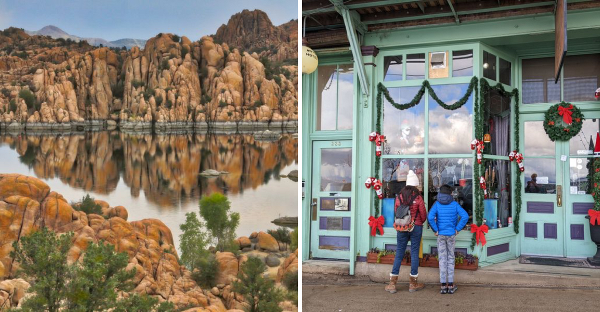 Prescott gathers around the Courthouse Plaza where tall trees fold shade over green lawns.