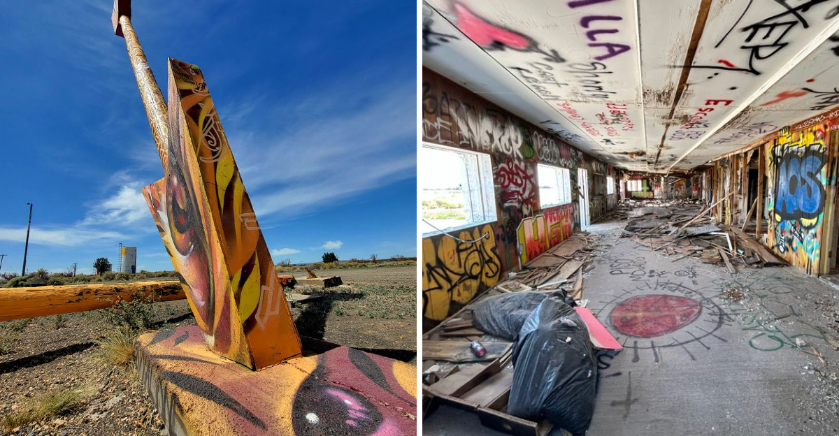 The site whispers stories of road-trip diners, souvenir stands, and the golden age of car travel.
