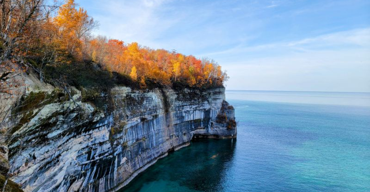 Nature painted a masterpiece along Lake Superior’s southern shore, where mineral-streaked cliffs rise dramatically from crystal-clear waters in shades of copper, rust, green, and gold.