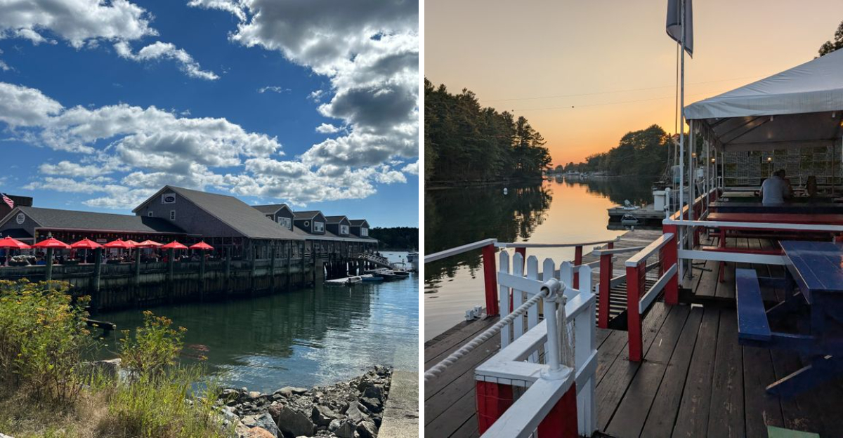 Tables line the dock and the shore, and views stretch over lobster boats that pivot with the tide while gulls skim low.