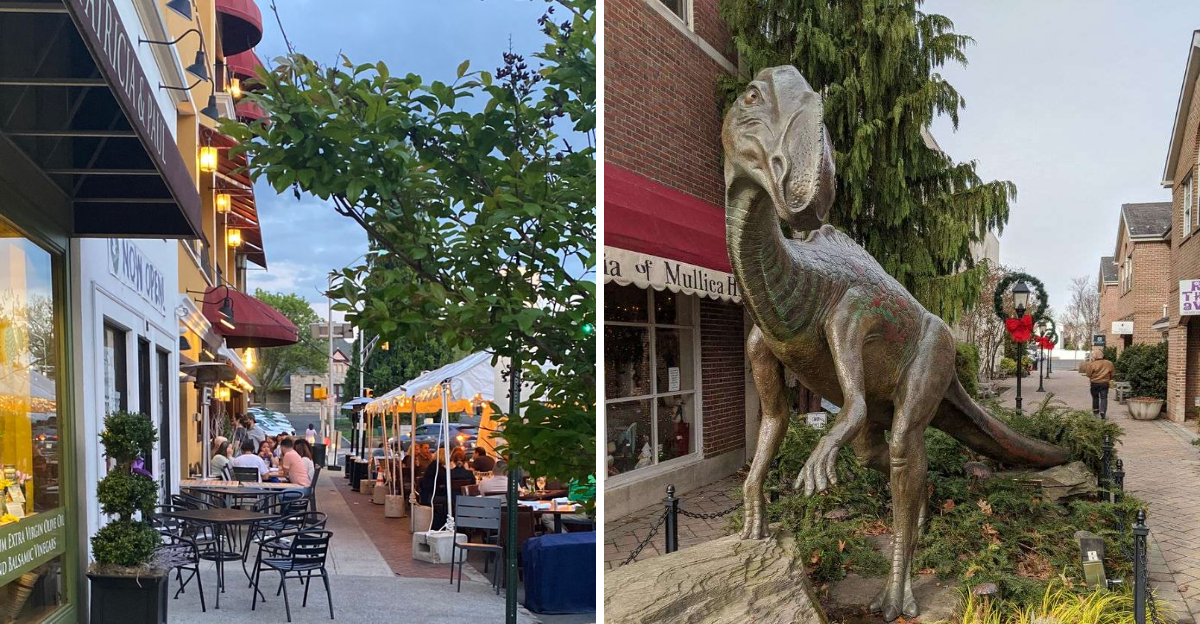 Kings Highway in Haddonfield transports you straight into colonial America, complete with red-brick sidewalks, working gas lamps, and architecture that dates back centuries. The famous Hadrosaurus foulkii statue celebrates the town’s claim to fame as the site where the first nearly complete dinosaur skeleton was discovered in 1858.