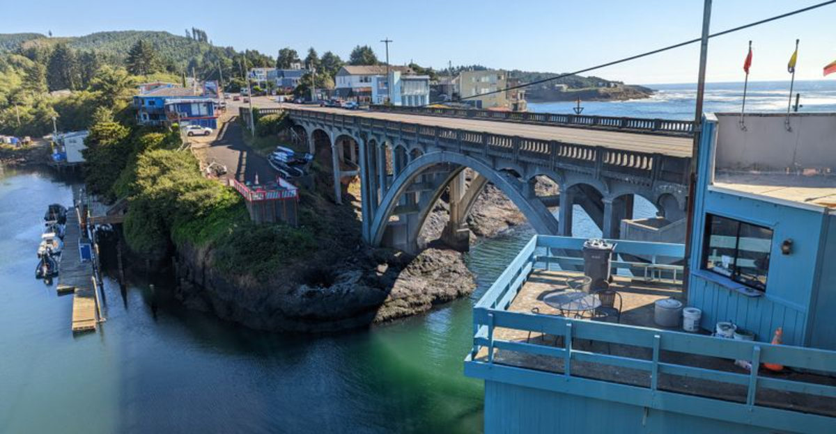 The Siuslaw River Bridge arches gracefully, a landmark visible from many vantage points.