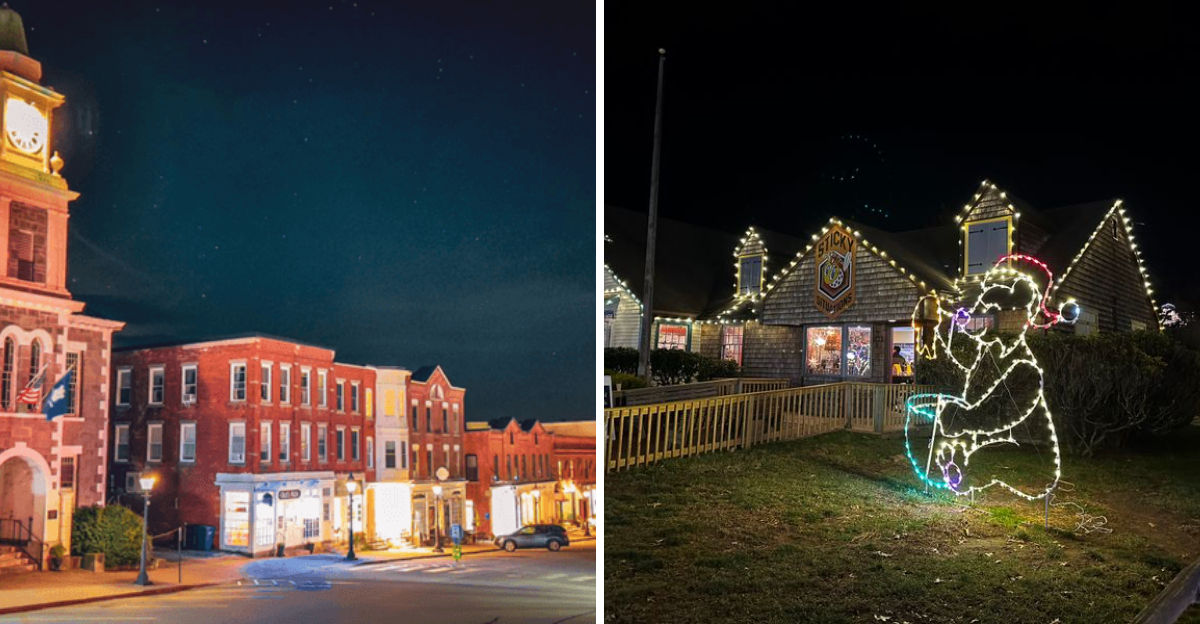 In winter, twinkle lights and wreaths trace rooflines and porches, creating a gentle glow.
