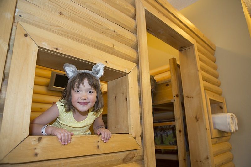 Another signature Great Wolf activity is the Story Time, in which children and adults gather at night to to listen to stories in their pajamas. Storytime takes place at the lobby’s enormous cuckoo clock, and though it doesn’t “cuckoo,” the stately animatronic trees, smiling animals and a young boy do sing together. These themes and stories change seasonally. (Warning: Story Time can get crowded, so show up early if you want a seat up close.)