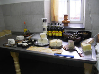 And of course we had to go find the cheese. There are signs all over the place saying “Tzfat cheese à ” or “holy Tzfat cheese à ” all of which led to another and then yet another sign. Reaching the cheese factory is like going thorough a maze, literally. When we get there it was just a little place—a table covered with different cheeses, a few tables for sitting down, and a room with vats in it that are used to make the cheese. Unfortunately we didn’t get to find out how cheese is made (we’d have to come back on Sunday for that, except that we were leaving Tzfat on Saturday night), but we did get to try every single one of his cheeses. They weren’t expensive, either; I got small pieces of feta and the special Tzfat cheese for only $10. That plus the four rugalach I’d brought from