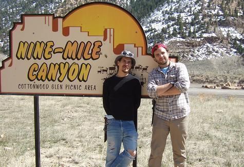 We stopped for a quick lunch at an abandoned homestead with a garish Nine Mile Canyon sign. Barb insisted that we pose for pictures. After grudgingly obliging and a little more exploration, we head back to the car. The book and my GPS tell us the next site is around the next bend.