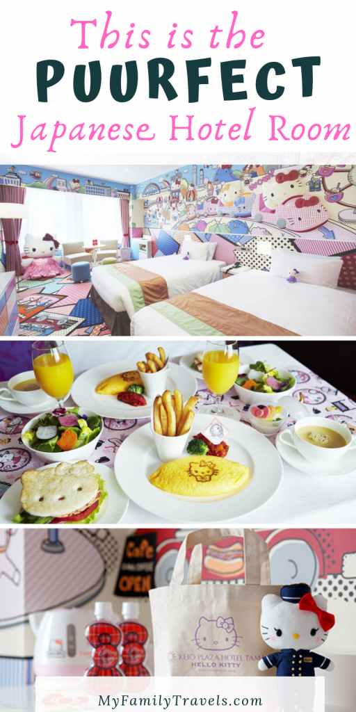 Vertical collage with images of Hello Kitty room, Kiki and Lala photo spot and Hello Kitty toy from Keio Plaza Hotel Hajioji. Photos c. Keio Plaza Hotel