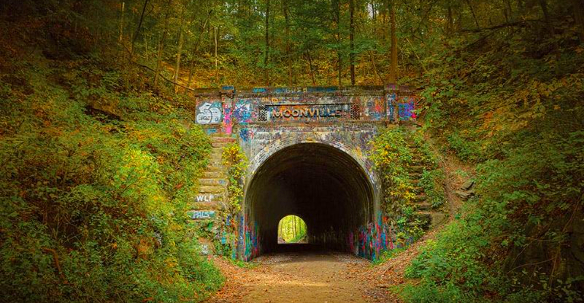 Not all ghosts wear white sheets. In Vinton County, the Moonville Tunnel is infamous for a headless conductor who’s apparently terrible at letting things go. The abandoned railroad tunnel, built in the 1850s for a vanished mining town, still stands among thick woods.
