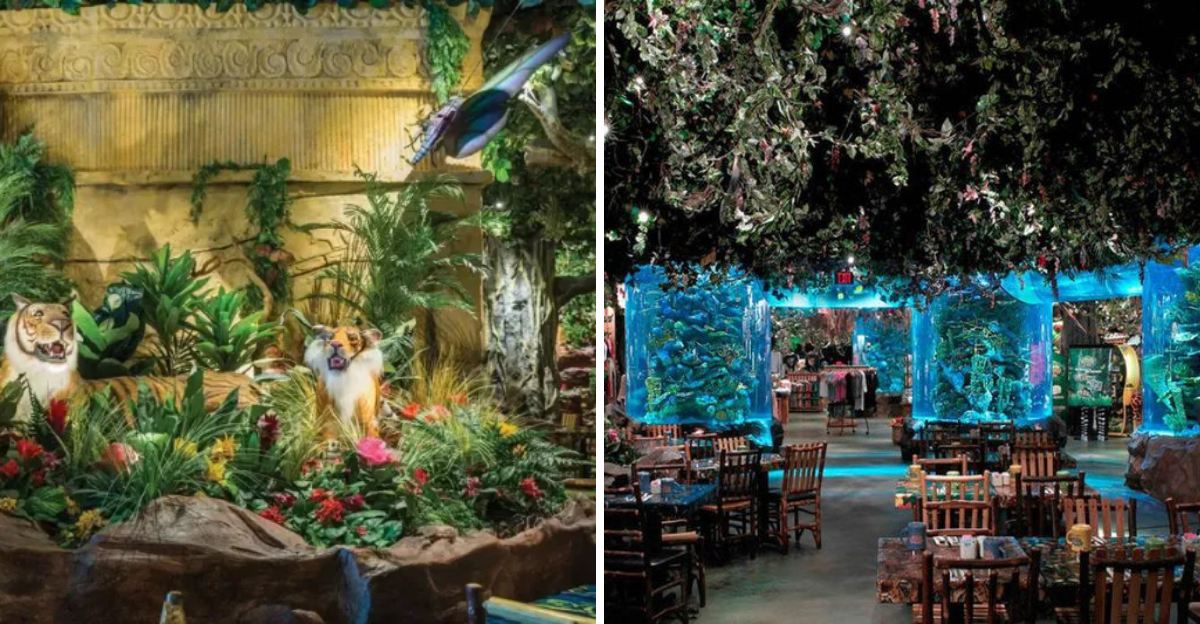 Niagara Falls is already dramatic on its own, but just a few blocks from the roar of the water you’ll find a different kind of spectacle. The Rainforest Café here doesn’t just serve dinner, it puts you right in the middle of a playful jungle setting.
