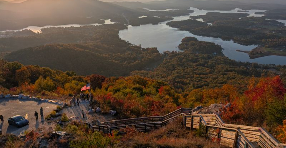 Bell Mountain rises sharply above Lake Chatuge, and the narrow road climbs with intention to a pair of metal platforms.