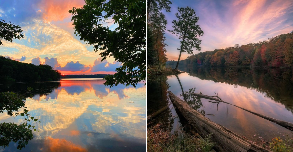 Named after a long-gone iron furnace, Lake Vesuvius rests in the rolling hills of southern Ohio’s Wayne National Forest. Rock formations tower above the eastern shoreline, creating dramatic reflections on the water’s surface during sunrise.