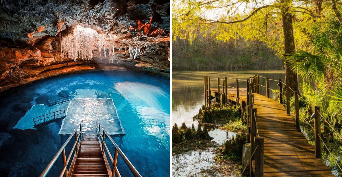 Devil’s Den Spring, near Williston, is a unique prehistoric underground spring inside a dry cave, offering crystal-clear, 72-degree water year-round. Formed from a collapsed cavern roof millions of years ago, this geological wonder is popular with snorkelers and scuba divers due to its visibility and dramatic rock formations.