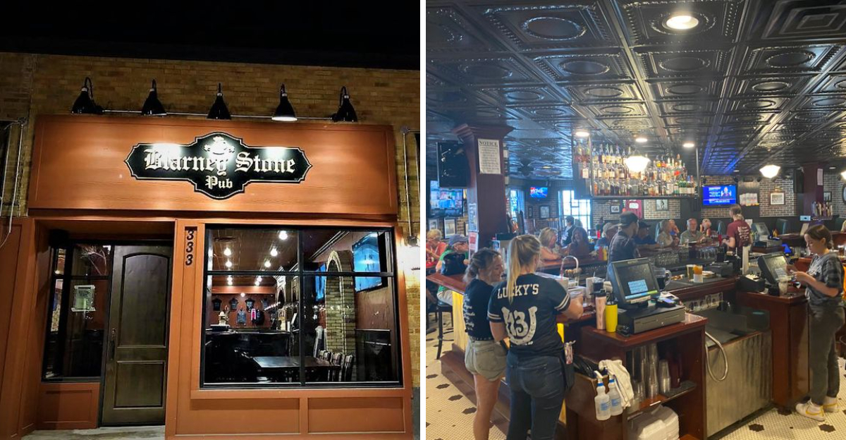 Blarney Stone Pub occupies a handsome corner of downtown with stone walls, tall windows, and an inviting glow that spills onto the sidewalk.
