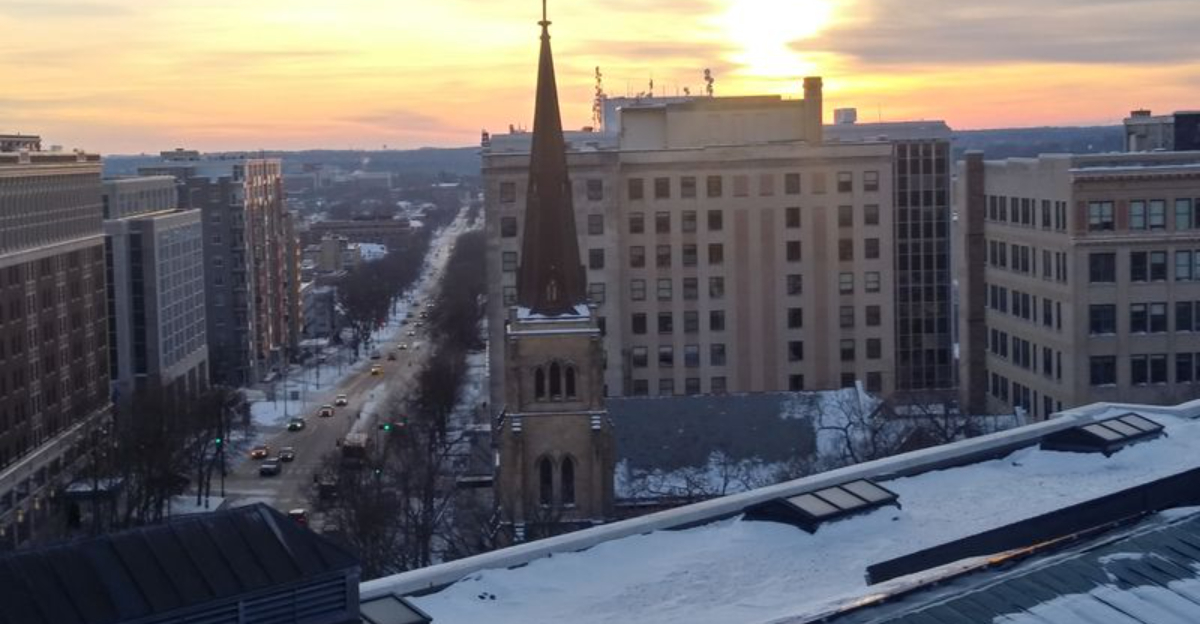 Church spires and dormers rise beyond the treeline, setting a classic Midwestern scene.