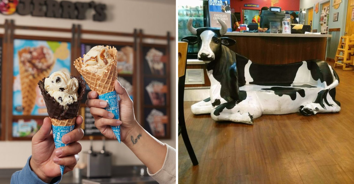 The decor leans into the playful, Vermont-inspired personality that Ben and Jerry’s has always been known for. Bright colors and fun signage make the shop feel cheerful even when the line is long.