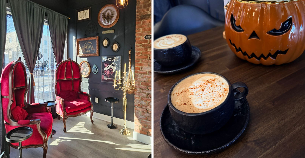 Forget the bright, minimalist shops with white walls and blonde wood. This place is all about moody lighting, drinks named after goth icons, and decor that makes you wonder if you accidentally wandered into a haunted mansion.