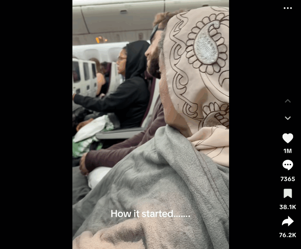 Knees angle into the aisle; a head edges toward a shoulder that clearly doesn’t want it. The clip is brief but claustrophobic, a visual of boundaries dissolving inch by inch. The caption sets the tone: a long flight turned slow burn, Doha to New York, with no relief in sight.
