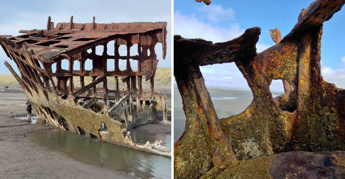 You can feel the salt air change the moment the hulking ribs of the Peter Iredale rise from the sand.