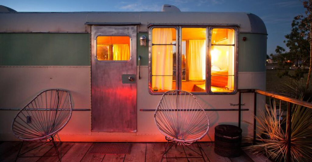 This offbeat oasis blends vintage trailers, teepees, and yurts with wide-open West Texas horizons that glow with mysterious lights across empty fields.