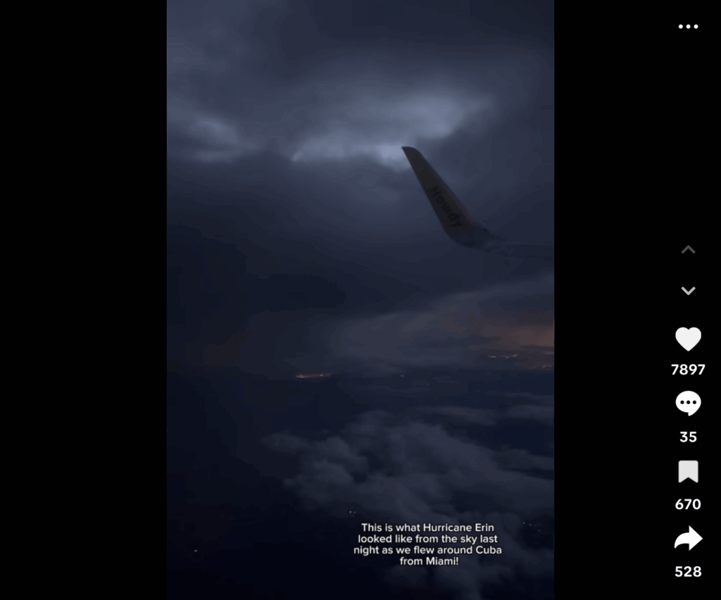 Traveler @ericabarbour5 filmed seven seconds of that spectacle and uploaded it to TikTok. The short clip, captioned simply “Flying out of Miami last night, Erin lighting up the horizon,” spread fast through weather and aviation circles. Viewers replayed it frame by frame, debating how close the aircraft really was and whether lightning like that could appear so far from the eye of a storm.