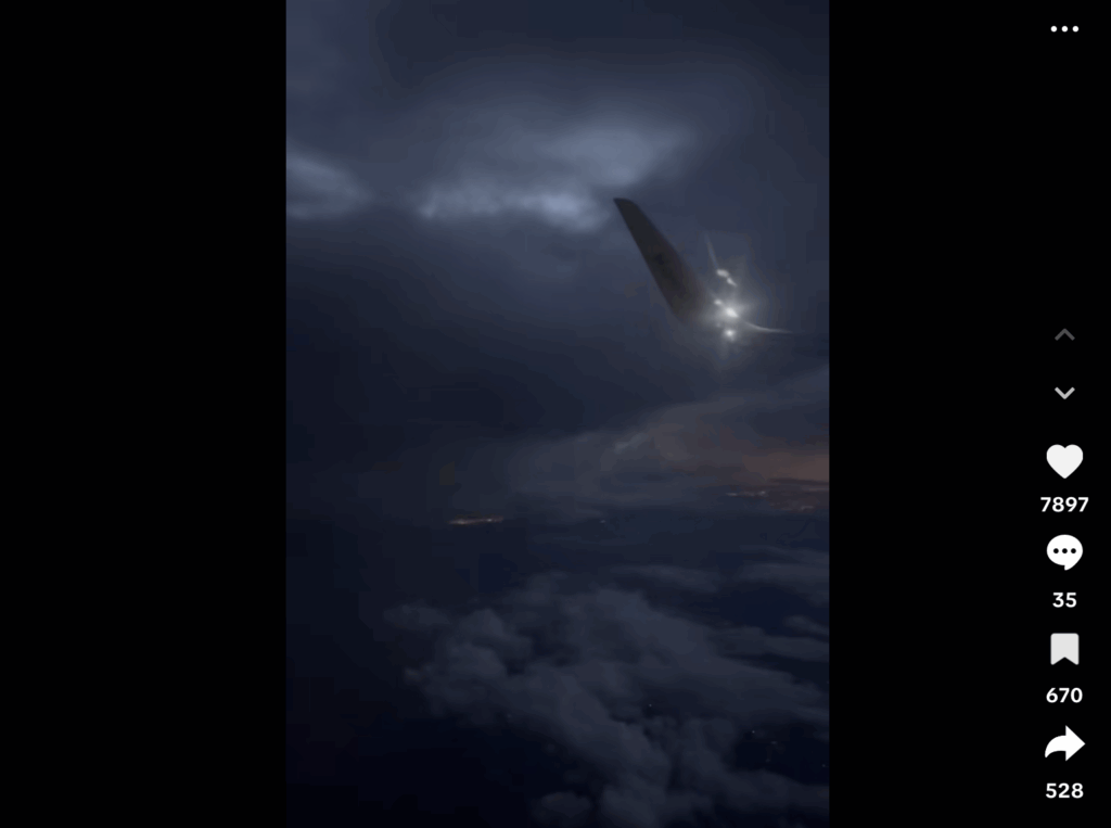 The TikTok footage is brief. A section of wing glows silver for an instant, then darkness returns. The cabin hums steadily. Lightning pulses again, outlining stacked clouds like stone columns. There is no turbulence in the frame, only contrast, quiet inside, chaos outside.