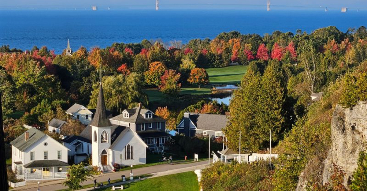 Michigan scenery surrounds the village, with inland lakes, orchards, and overlooks close at hand.