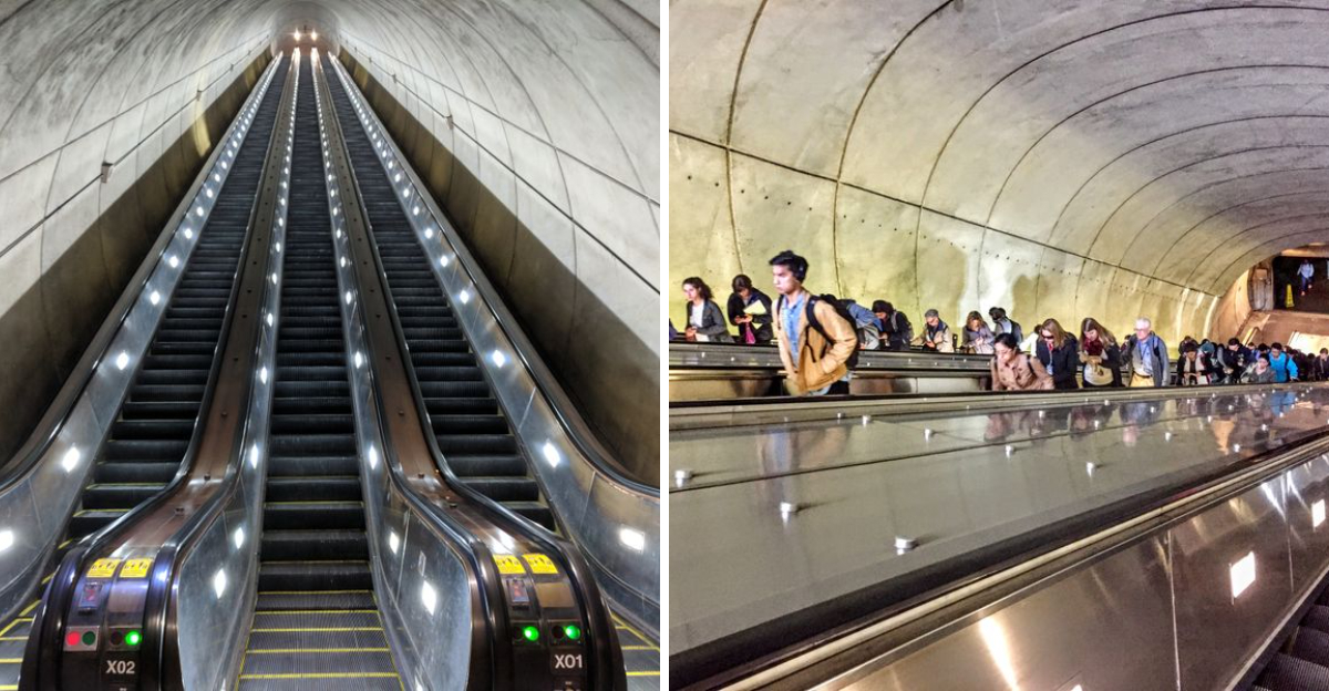 Standing at the top of the Wheaton escalator gives you that same stomach-dropping feeling as peering down from a tall building. The 230-foot journey plunges riders deep underground at a 30-degree angle, taking a full 2 minutes and 45 seconds to complete.