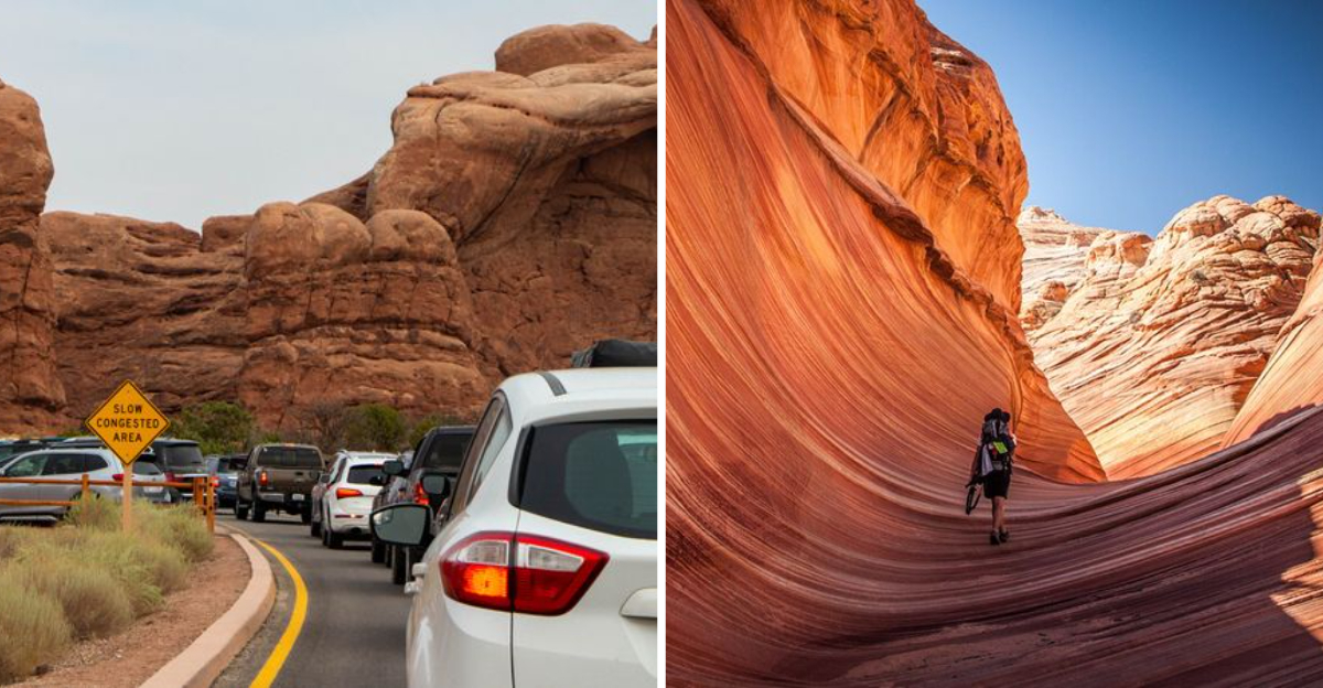 Hikes like Angels Landing in Zion and Delicate Arch in Arches attract dense clusters of hikers at narrow sections, stairs, and viewpoints. Utah’s iconic routes often funnel people into tight spaces where passing is awkward and photo stops increase bunching.