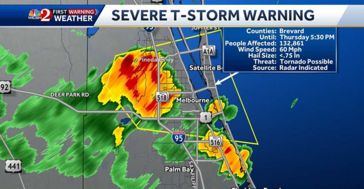 Baseball-sized hail has already been reported in neighboring states as this storm system barrels toward Florida. Weather radar shows intense thunderstorm cells developing rapidly, with some containing rotation that could spawn isolated tornadoes in addition to the primary threats.