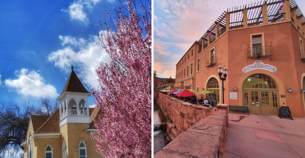 Manitou Springs spreads along a winding main street with pavilions that mark public mineral springs.