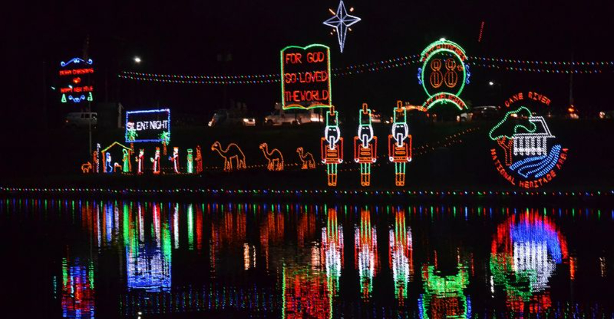 The riverbank along Cane River Lake turns into a serene promenade during the holidays, with lighted set pieces mirrored on still water. Benches, lawns, and terraced steps encourage lingering, and there are multiple unobstructed spots for tripods and family photos. Seasonal music occasionally drifts from nearby stages, though many evenings remain pleasantly quiet.