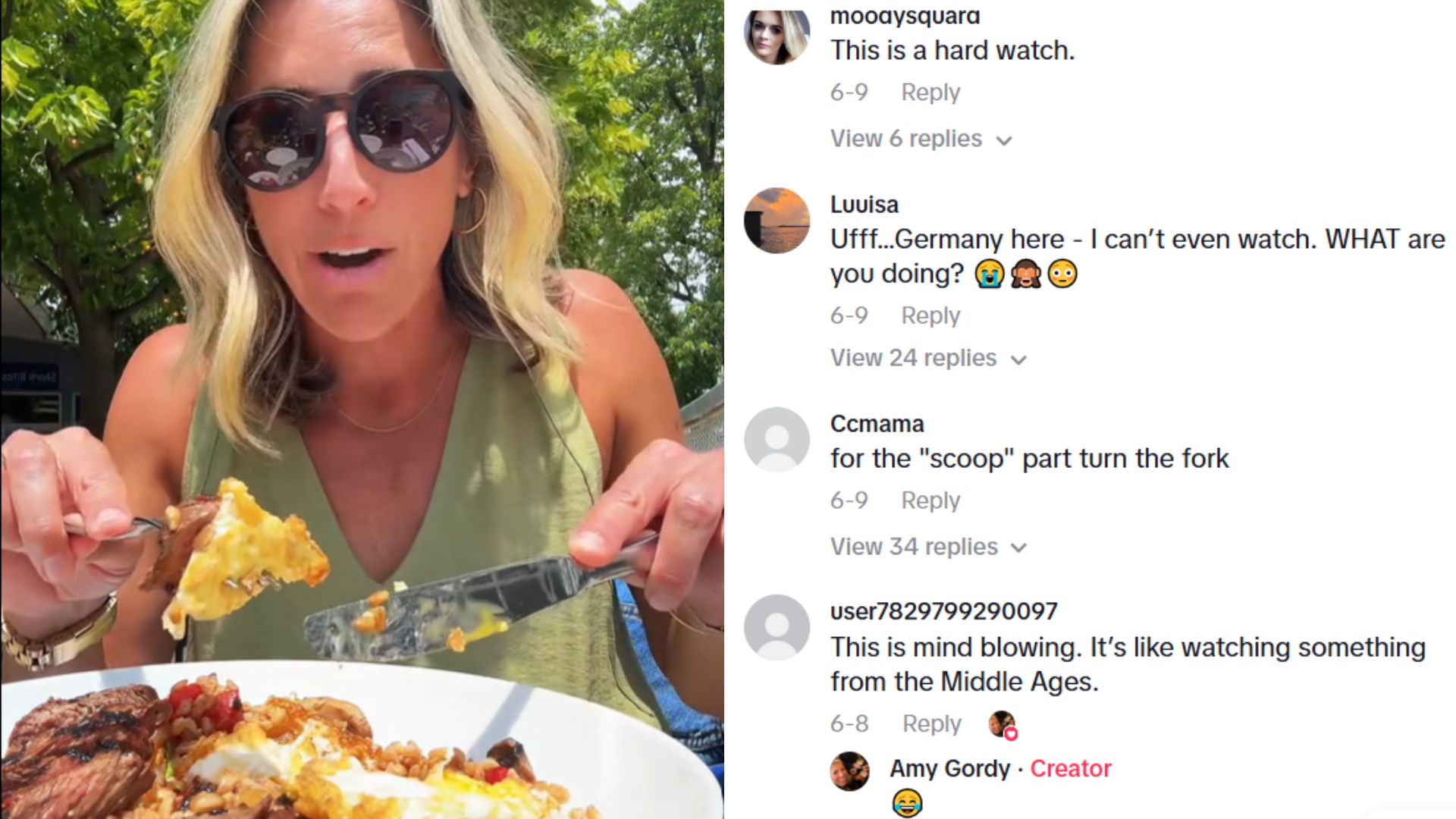 Since posting the video on June 9, Amy’s clip has racked up over 2.9 million views on TikTok. Her account, @amygordy1, became a hub for curious viewers and international critics alike. The video’s caption reads: “Trying to use silverware the European way (or I guess the rest of the world way),” which only added fuel to the cultural fire.