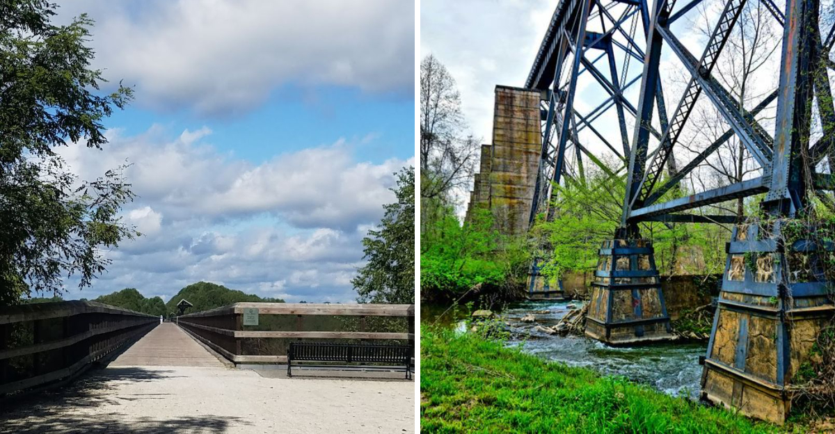 The old railroad bed has been converted into a path that cuts through forests and farmlands, with a thick canopy of trees overhead that makes you feel like you are moving through a tunnel of green. The highlight is the high bridge itself, a long stretch above the river that makes you stop just to take it in.