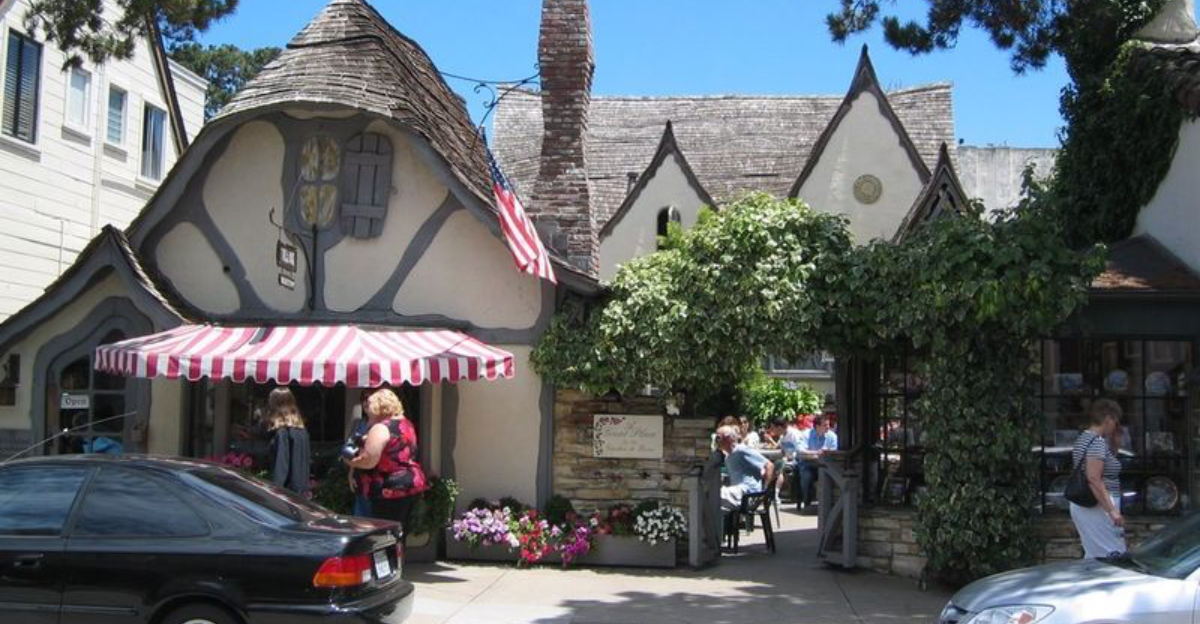 Begin on Ocean Avenue, Carmel-by-the-Sea, California 93921, where eaves tilt playfully and chimneys twist toward the sky.