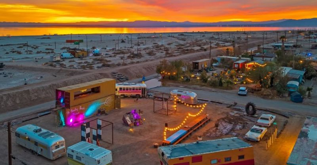 Travelers arriving in Bombay Beach are greeted by an unexpected feast for the senses. The town’s quirky charm is immediately apparent, with colorful art installations dotting the landscape against the serene backdrop of the Salton Sea.