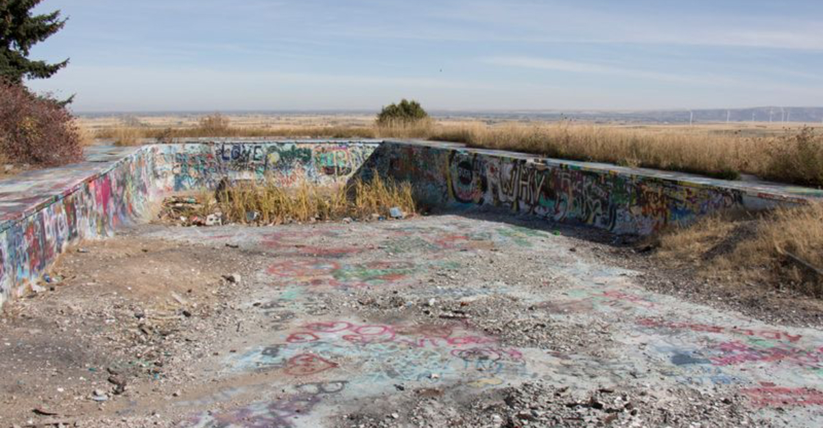The main pool now looks like a sunken bowl, its smooth surface broken by weeds and dust. I found old fence posts half-leaning and short pipes that rise from the soil like stubborn markers. Graffiti dots a few walls, most of it weathered into soft colors. Nothing felt staged or curated. It simply sat where time placed it. I kept to firm ground and stayed clear of any edges.