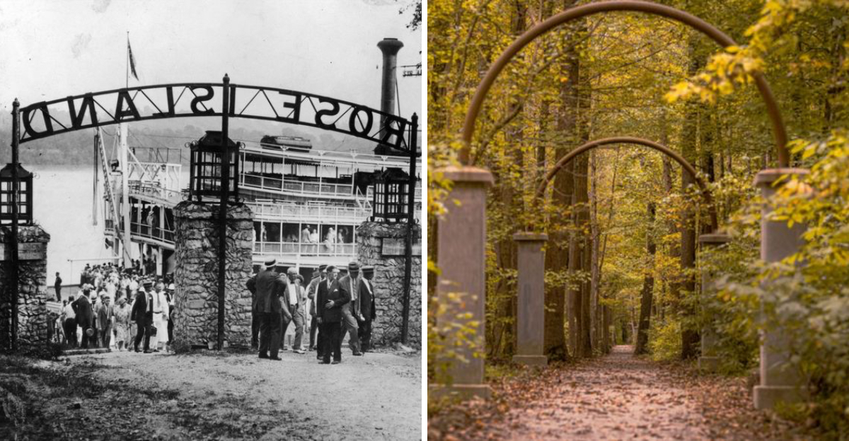 Follow the line of interpretive signs that trace Rose Island’s main corridor. Each placard stands like a marquee, pointing to where lights once turned night into carnival day. The present is a clear stage, and the past takes the lead role through careful captions.