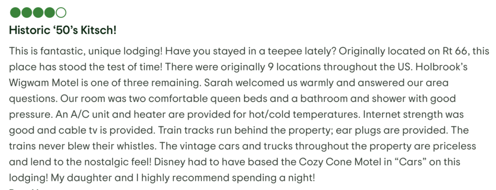“Stopped here on a cross-country trip. My kids went nuts over the idea of sleeping in a wigwam. It’s kitschy, weird, and perfect. Don’t expect luxury, expect a story.” – Reddit