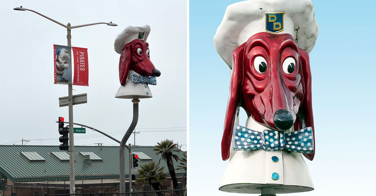 Most memorable was the brand’s towering fiberglass dachshund head mascot – complete with a bow tie and chef’s hat – that adorned each location. While the restaurants are no longer in operation, several of these giant dog heads have been preserved and restored by local preservationists. One prominent head is now a designated San Francisco Landmark (No. 254) and can be seen near Ocean Beach at Sloat Boulevard.
