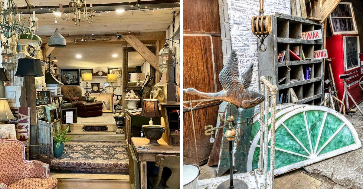 Furniture pieces sit beside delicate porcelain figurines. Oil paintings hang above rusted industrial finds.