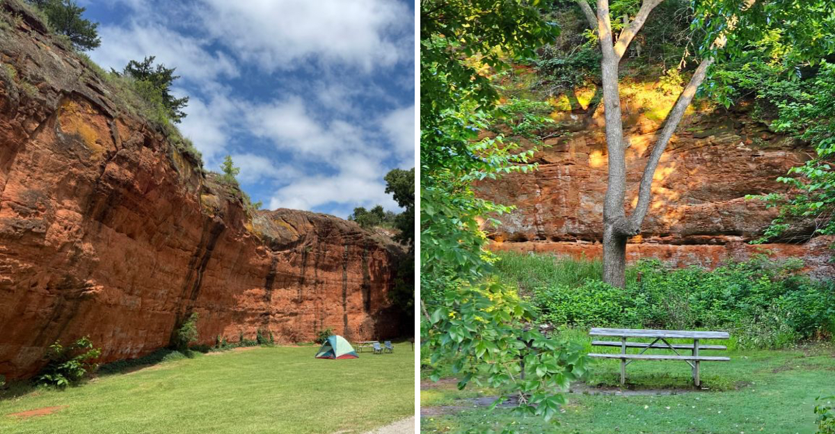 Red Rock Canyon sits just outside Hinton, Oklahoma, carved into the earth like a secret chapter of American history. The rust-colored sandstone cliffs rise dramatically from the surrounding plains, creating a landscape that once served as a crucial passage for pioneers heading west during the 1800s.