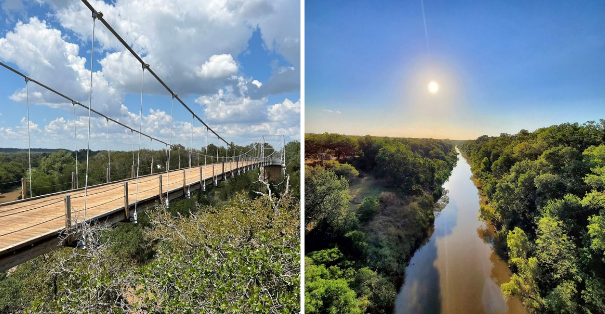 First-time visitors often describe a moment of hesitation right in the middle of the span. The water below is visible, the bridge is swaying softly, and the whole experience feels genuinely surreal for a public road in Texas.