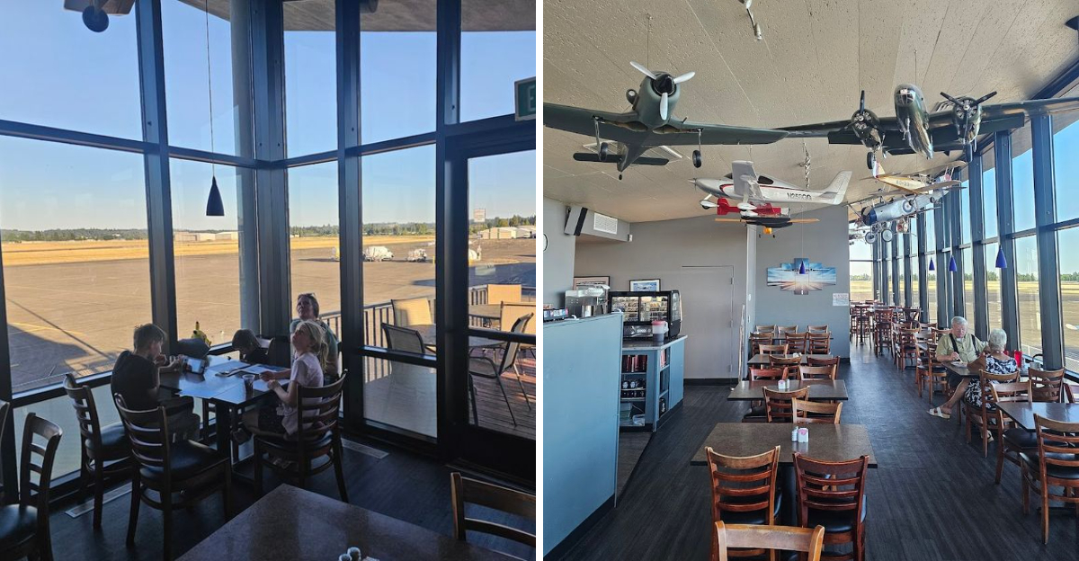 Sitting down with a hot plate while a small Cessna taxis past your window is genuinely one of the more unusual breakfast experiences Oregon has to offer. The casual pace of a weekend morning fits perfectly here.
