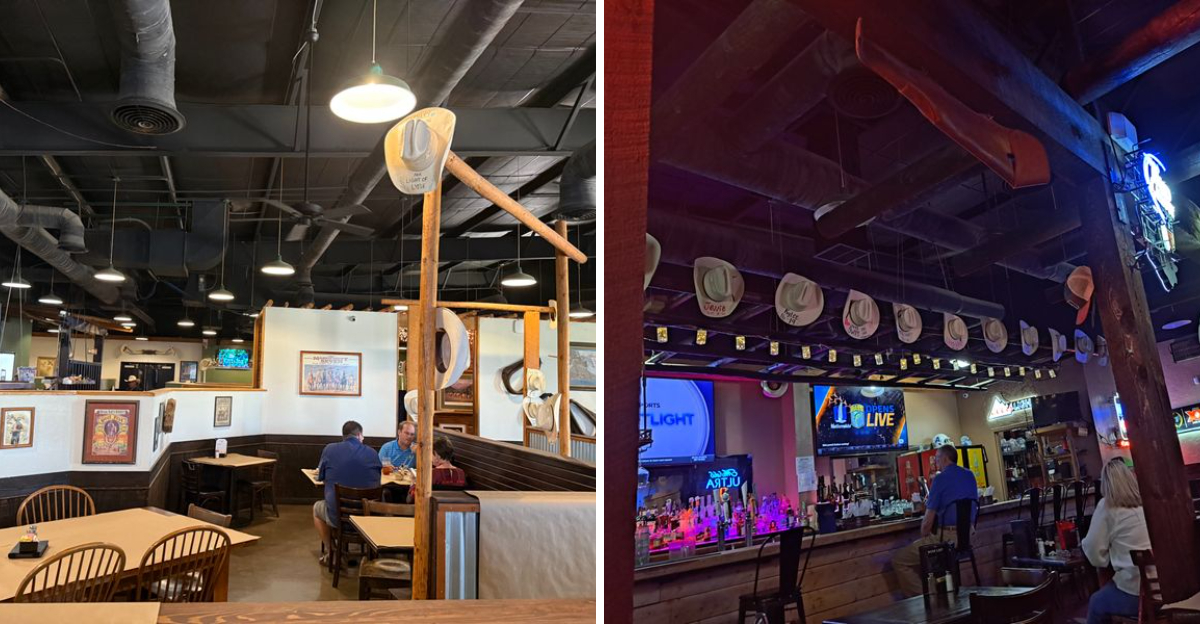 Cowboy hats line the walls, rustic wood beams stretch across the ceiling, and the whole place has a warm, welcoming vibe that feels genuine.