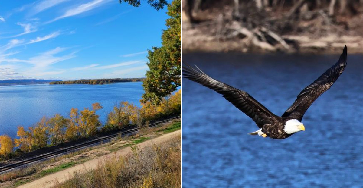 Keep your eyes up, because the eagles here do not need an introduction. Along the Mississippi Flyway, they ride the air like they own the script, wings flat and steady as they scan the water for a flash.