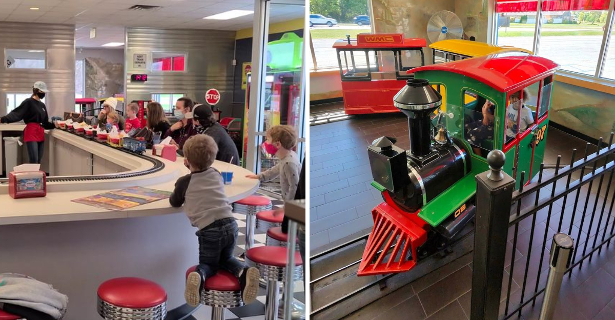 I have eaten at countless family restaurants across Indiana, but nothing quite prepared me for the moment a miniature train rolled right up to the counter and delivered my food.